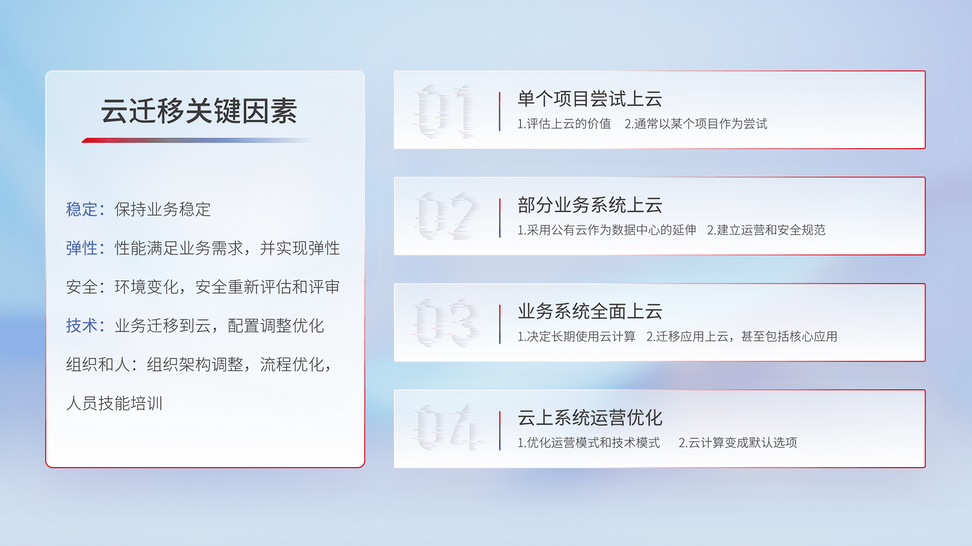 结合实际业务,,从规划设计、、、、云平台选型、、、、云原生改造、、数据迁移、、集成交付,,迁移全过程为客户识别最佳上云路径,,,,做好风险识别管理,,设计网络架构、、、身份权限、、安全审计合规、、、操作审计、、、、日志审计、、、、监控告警策略、、、、多站点容灾设计等,,,,对云上基础设施进行整体规划,,提升IT治理水平,,,以满足弹性、、、高可用、、高性能的需求。。。