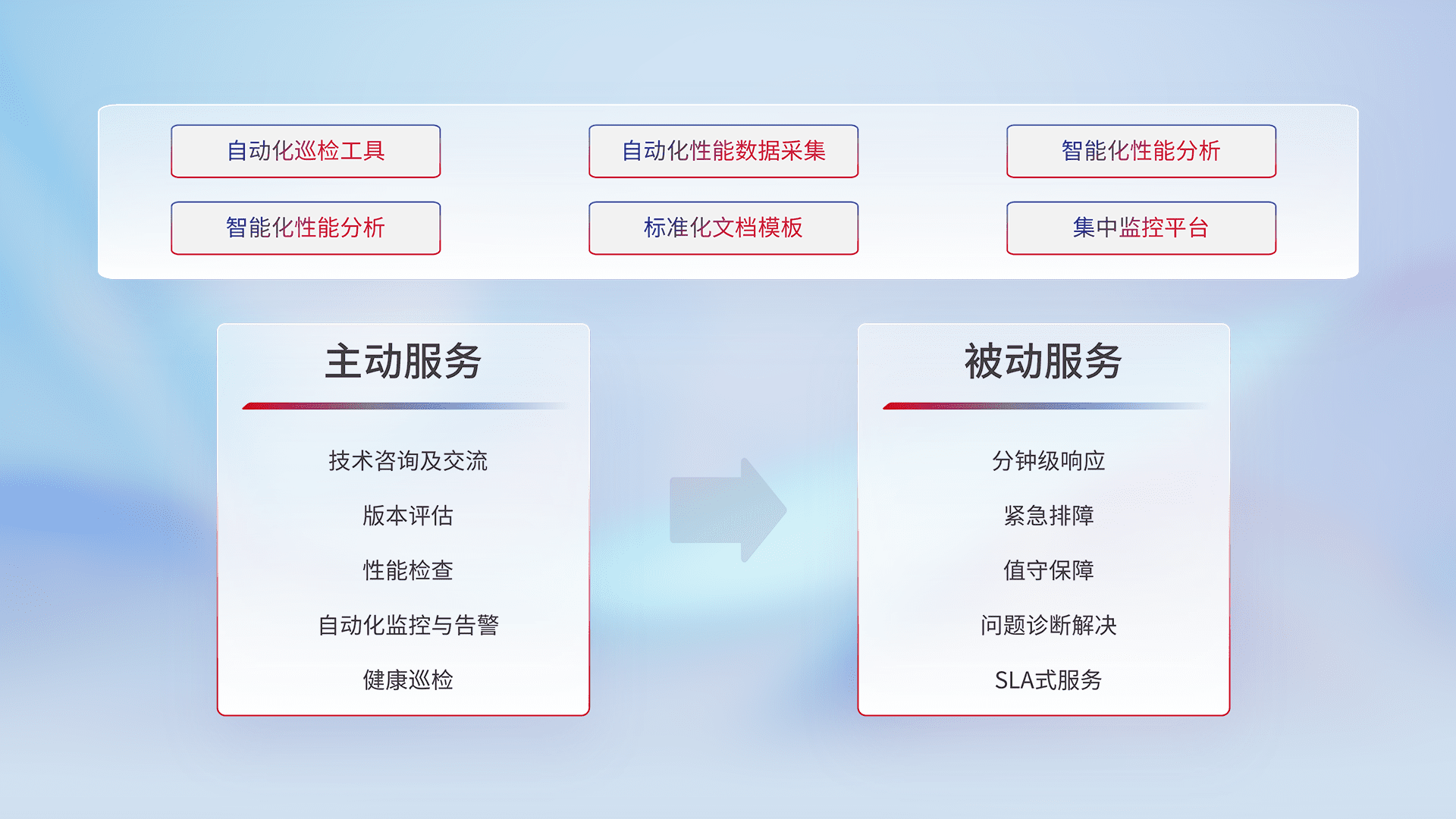 智能化工具和标准化文档,,,保障服务质量,,,,提供主动服务(包含技术咨询、、、、版本评估、、、、性能检查、、自动化监控与告警、、健康巡检)和被动服务包含(分钟级响应、、紧急排障、、、值守保障、、、问题诊断解决、、、SLA服务)。。